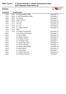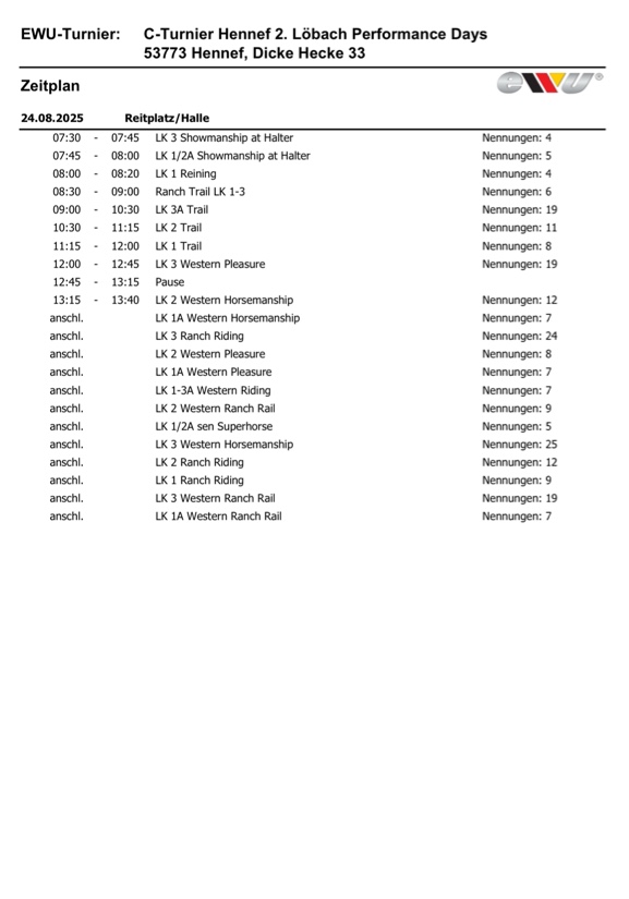 Nach unserer Premiere im letzten Jahr, veranstalten wir dieses Jahr unser zweites EWU C-Trophy Western Turnier. Mit 103 Pferden und 325 Starts haben die Teilnehmerzahlen unsere Erwartungen 2024 weit übertroffen und wir toppen diese Zahlen mit 129 Pferden und 463 Starts in diesem Jahr! Zusätzlich, zu den 96 ausgeschriebenen Prüfungen, werden wir Samstag abends eine Turnier Party veranstalten. Neben tollen Sachpreisen für unsere Teilmehmer, durch die enorme Anzahl an Sponsoren, werden auch wieder zahlreiche Aussteller vor Ort sein und auf einer Shopping Meile Ihre Waren präsentieren. Für das leibliche Wohl wird mit einem schönen Frühstücksangebot, über Mittagessen, bis hin zum Grill-Abend bestens gesorgt sein!